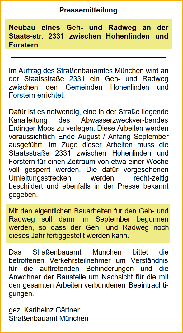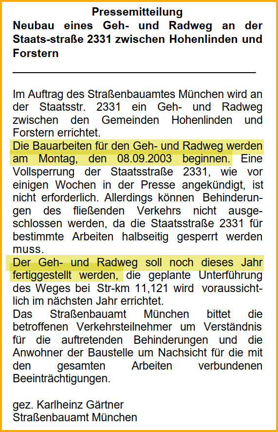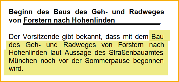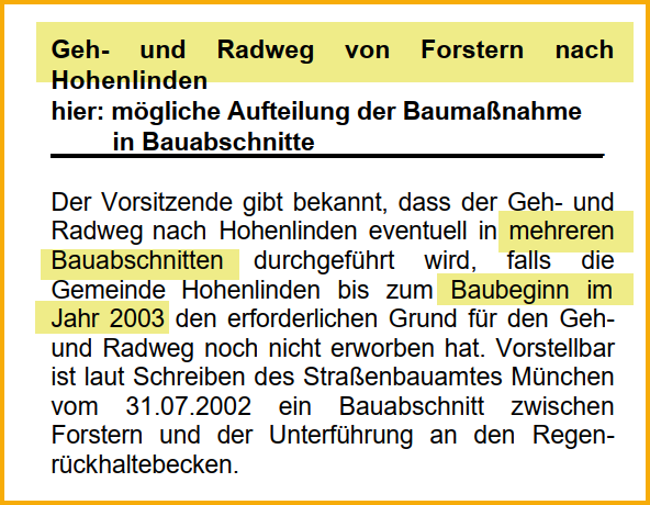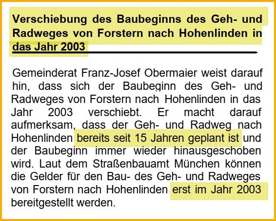 Geh- und Radweg nach Hohenlinden zurück zur Projektübersicht 1987 Erste Planungen 17.07.2002 Gemeinderatssitzung Quelle: Forsterner Amtsblatt August 2002 Text vorlesen lassenhttps://forstern-portal.de/wp-content/uploads/2002-08-forsterner-amtsblatt-weg-nach-hohenlinden.mp3 27.08.2002 Gemeinderatssitzung Quelle: Forsterner Amtsblatt vom Oktober 2002 Text vorlesen lassenhttps://forstern-portal.de/wp-content/uploads/2002-08-27-forsterner-amtsblatt-weg-nach-hohenlinden.mp3 20.05.2003 Gemeinderatssitzung Quelle: Forsterner Amtsblatt vom Juli 2003 Text vorlesen lassenhttps://forstern-portal.de/wp-content/uploads/2003-07-forstern-amtsblatt-radweg-hohenlinden.mp3 August 2003 Gemeinderatssitzung Quelle: Forsterner Amtsblatt vom August 2003 Pressemitteilung vorlesen lassenhttps://forstern-portal.de/wp-content/uploads/2003-08-forstern-amtsblatt-radweg-hohenlinden.mp3 Oktober 2003 Quelle: Forsterner Amtsblatt vom Oktober 2003 Pressemitteilung vorlesen lassenhttps://forstern-portal.de/wp-content/uploads/2003-10-forstern-amtsblatt-weg-nach-hohenlinden.mp3 07.10.2003 Quelle: Forsterner Amtsblatt vom November 2003 Text vorlesen lassenhttps://forstern-portal.de/wp-content/uploads/2003-11-forstern-amtsblatt-weg-nach-hohenlinden.mp3 04.11.2003 Quelle: Forsterner Amtsblatt vom Dezember 2003 Text vorlesen lassenhttps://forstern-portal.de/wp-content/uploads/2003-12-forstern-amtsblatt-weg-nach-hohenlinden.mp3