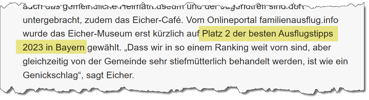 Der Betreiber des Eicher-Museums und des angeschlossenen Cafés in Forstern, der Verein Eicherfreunde Forstern, befürchtet durch aktuelle Gemeindebaumaßnahmen vor dem ehemaligen Eicher-Gebäude Nachteile für sein Vereinsprojekt. Hintergrund ist der geplante Radwegebau entlang der Staatsstraße 2331, durch den viele Parkplätze entfallen; nur wenige verbleiben und sollen zeitlich begrenzt ausgewiesen werden. Der Vorsitzende Egon Eicher sieht darin eine Gefährdung insbesondere des Cafés, das auf ausreichende Stellplätze angewiesen sei – gerade weil viele Besucher ältere Menschen oder Familien mit Kleinkindern seien. Die Gemeinde sieht dies nicht als existenzielle Bedrohung, betont, dass bislang ein Auge zugedrückt worden sei und dass weiterhin Parkmöglichkeiten für Museum, Café und Jugendtreff angeboten werden sollen. Zudem gebe es frühere Ideen, etwa eine Parkgarage oder geordnete Parkplätze mit Einbahnregelung, die jedoch nicht umgesetzt worden seien. Inzwischen wurde zwischen Eicher und der Gemeinde ein weiteres Gespräch geführt; das Museum soll offen bleiben, beim Café bleibe die Zukunft jedoch offen.