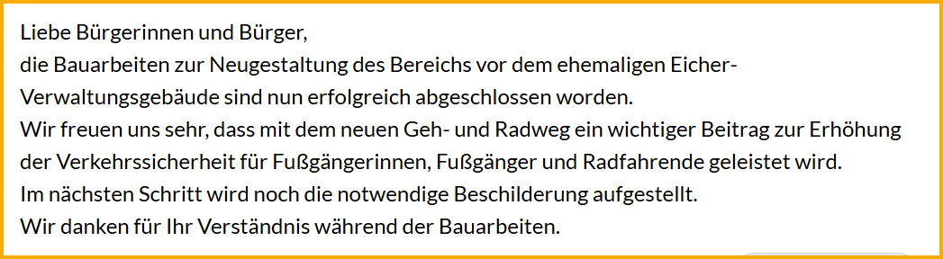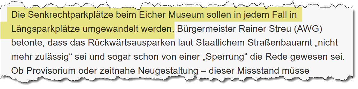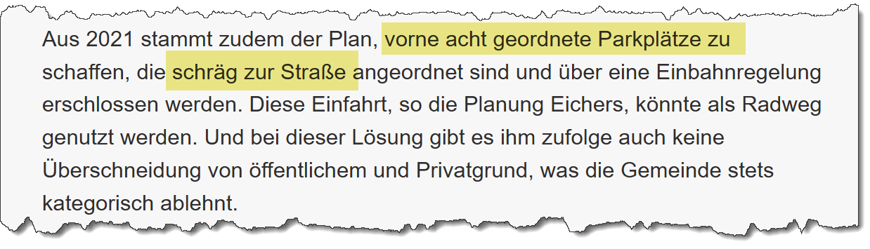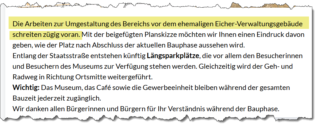 Zusätzlich ist vorgesehen, den Straßenraum optisch aufzuwerten und den innerörtlichen Charakter zu stärken. Der Bereich soll künftig klarer strukturiert und übersichtlicher werden, um Konflikte zwischen parkenden Autos, Radfahrern und Fußgängern zu vermeiden. Die Maßnahmen sind Teil eines größeren Rahmenplans für die Ortsdurchfahrt, werden aber am Eichermuseum als besonders dringlich angesehen.