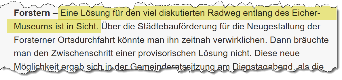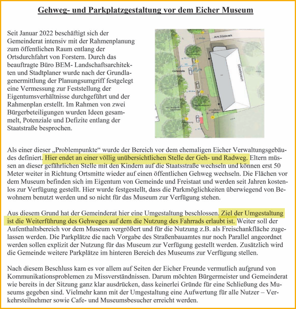 Im Bereich des Eichermuseums an der Ortsdurchfahrt Forstern ist eine Neugestaltung geplant, um die Verkehrssicherheit deutlich zu verbessern. Die bisherigen Senkrechtparkplätze sollen in Längsparkplätze umgewandelt werden, da das rückwärtige Ausparken aus verkehrsrechtlicher Sicht problematisch ist. Dadurch entsteht Platz für einen kombinierten Geh- und Radweg, der vor allem Fußgängern, Kindern und langsam fahrenden Radfahrern mehr Sicherheit bieten soll.