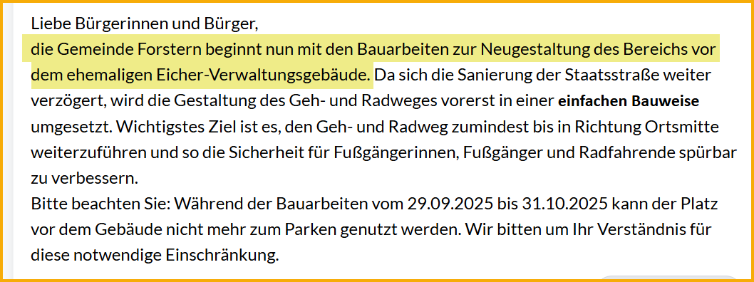 Die Gemeinde Forstern hat ein langjähriges Problem an ihrem südlichen Ortseingang gelöst: Der Rad- und Fußweg am Eicher-Gebäude entlang wurde verlängert und damit die Verkehrssituation deutlich sicherer gestaltet. Die Arbeiten begannen Ende September und konnten nach etwa drei Wochen abgeschlossen werden. Ziel war es, den Geh- und Radweg mindestens bis in Richtung Ortsmitte fortzuführen, damit Fußgänger und Radfahrer nicht mehr gefährlich an der stark befahrenen Staatsstraße entlanglaufen müssen. Zusätzlich sind entlang der Staatsstraße neue Längsparkplätze entstanden, die zeitlich begrenzt für Pkw genutzt werden sollen, um Dauerparker zu vermeiden.